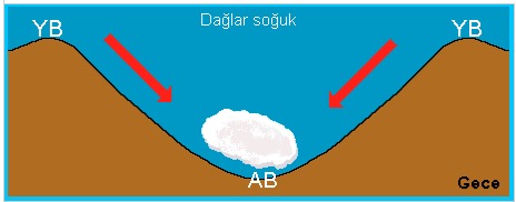 2. Dağ Meltemi: Geceleri nem oranı düşük olan dağ yamaçlarında, sıcaklık kaybı; nem oranı daha fazla olan vadilere göre daha fazladır. Yani geceleri dağ yamaçları vadilere göre daha çabuk soğurlar. Böylece dağ yamaçları yüksek basınç alanı, vadi tabanları da alçak basınç alanı durumundadır.