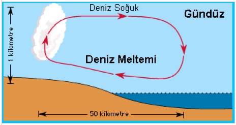 3. Deniz Meltemi: Denizler karalara oranla daha geç ısınıp, geç soğur. Gündüzleri geç ısınan deniz, yüksek basınç alanı durumuna gelir. Daha çabuk ısınan kara ise yerel alçak basınç alanı durumundadır.