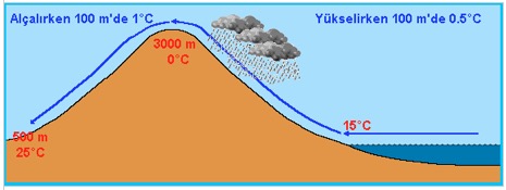 Yükselen hava kütlesinin sıcaklığı, her 200 m’de orta-lama 1°C azalır. Belirli bir yükseltiden sonra, içindeki nem, yoğunlaşma sonucunda yağış olarak yere düşer. Yamacı aşan hava kütlesi dulda yamaçta alçalırken kuru adyabatik nedeniyle her 100 m’de ortalama 1°C ısınır. Böylece ulaştığı yerde ısıtıcı etki yapar.