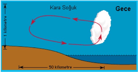 4. Kara Meltemi: Geceleri karalar denizlere göre daha çabuk soğurlar. Böylece kara üzerinde denize oranla yüksek basınç alanı; deniz ise alçak basınç alanı durumuna gelir.