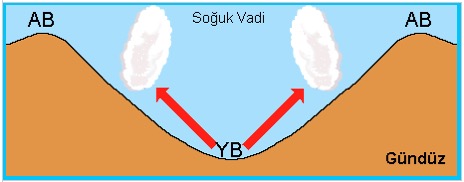1. Vadi Meltemi: Vadi tabanları dağ yamaçlarına oranla daha fazla neme sahiptir. Bundan dolayı gündüzleri vadiler, dağ yamaçlarına göre daha geç ısınır ve yerel alçak basınç alanı durumuna gelirler.