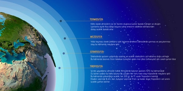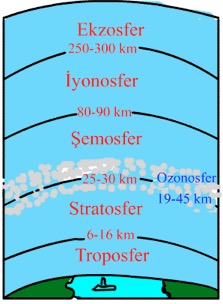 3. OZONOSFER: Güneşten gelen morötesi (ultraviyole) ışınlar tarafından oksijen moleküllerinin O3 ‘e dönüştürülmesiyle oluşur. Güneşten gelen zararlı ışınları tutar, soğumayı önler.