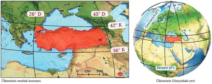 Türkiye, 36° - 42° Kuzey paralelleri ile 26° 45° Doğu meridyenleri arasında yer alır. Diğer bir ifadeyle, Türkiye Ekvator’un kuzeyinde ve Greenwich’in doğusunda bulunan bir ülkedir. Türkiye’nin matematik konumunun sonuçları şöylece sıralanabilir: