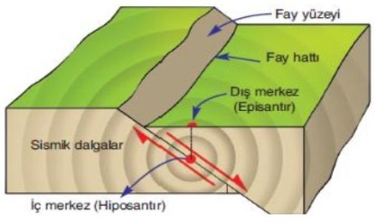 Yer kabuğu hareketleri, yer kabuğunu oluşturan tabakaların üzerinde çok büyük gerilimler oluşturur. Bu gerilimler neticesinde sert olan tabakalar kırılır. Bu kırık alanlar fay hatlarını oluşturur. Fayların geçtiği sahalar çoğu kez yer kabuğunun altında biriken enerjinin kolaylıkla yeryüzüne çıktığı alanlardır. Fay hatlarının geçtiği yerlerde deprem riski de fazladır.Dış merkez, depremin şiddetinin en fazla hissedildiği alandır.