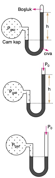 ManometrelerKapalı kaptaki gazları ölçmek için kullanılan aletlere manometre denir. Manometrelerde borunun ucu kapalı veya açık olabilir.Şekildeki cam kapta bulunan gazın basıncı kapalı uçlu manometrede h yüksekliğindeki cıvanın basıncına eşittir. Pgaz = Pcıva = h cm-Hg dir. Bunun anlamı, gazın basıncı h yüksekliğindeki cıvanın basıncı-na eşittir. Manometreler, baro-metrelerden faydalanılarak yapıl-mıştır. Açık hava basıncının P0 ve cm-Hg birimi cinsinden olduğu bir ortamda, açık uçlu manometrede cıva düzeyleri arasındaki fark şekildeki gibi h ise, Pgaz > P0 dır. Pgaz = P0 + h cm-Hg dir. h değeri cm cinsinden ise gaz ba-sıncı cm-Hg cinsinden bulunur. Açık uçlu manometrede cıva dü-zeyleri eşit ise, gazın basıncı açık hava basıncına eşittir. Pgaz = P0 dır. |