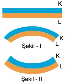 Oda sıcaklığında birbirine perçinli şekildeki K ve L çubuklarının boyca uzama katsayıları lK ve lL olsun, eğer lK > lL ise, metal çiftinin sıcaklığı artırılırsa görünümleri Şekil - I deki gibi, metal çifti soğutulursa görünümleri Şe-kil - II deki gibi olur.