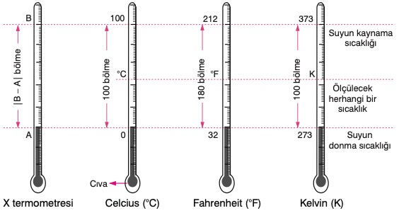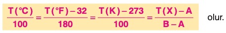 Celcius termometresinde okunan değer T(°C), Fahrenheit termometresin-de okunan değer T(°F), Kelvin termometresinde okunan değer T (K) ve herhangi bir X termometresinde okunan değer T (X) olduğunda, bunlar arasın-daki ilişki,