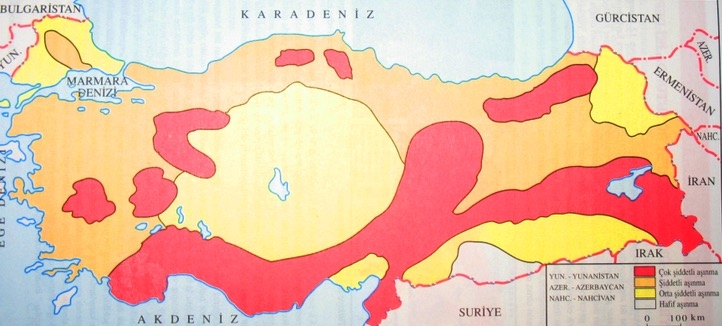 Yurdumuzun %45.9’u 1000-2000 m. yükseklikte kısaca dağlık, %62.5’u, %15 meyilden daha meyilli, engebeli bir yapıya sahip olması, çok değişik iklim farklılkları göstermesi, (yıllık yağış ortalaması Rize’de 2269,6 mm. Kars-Aralık ilçesinde 231,1 mm. Konya-Karapınar ilçesinde 278,0 mm) kolay ayrışabilen ana kayası ile dünyanın erozyona karşı en hassas bölgeleri içerisinde yer almaktadır. Nitekim, bugüne kadar süregelen yanlış arazi kullanımı, aşırı ve bilinçsiz hayvan otlatması ve ormanların insafsızca tahrip edilmesi sonucu binlerce yıldır çeşitli uygarlıkları barındırmış olan Anadolu’muzun %72’leri aşan kısmı erozyon etkisi altındadır. Bunun neticesinde yurdumuzun en verimli topraklarından denizlere, göl ve barajlarımıza yılda 450-500 milyon ton toprak taşınmaktadır. Bir başka ifade ile iki yılda 1 mm. toprak aşınıp taşınmaktadır. 1 cm. toprak tabiat olayları-iklim va ana kaya oluşumuna göre yaklaşık 1000 yılda meydana gelmektedir. Birim alandan taşınan toprak miktarımız ise Afrika’dan 22 kat, Avrupa’dan 17 kat, Kuzey Amerika’dan 6 kat fazladır. Kızılırmağ’ın bir yılda Karadeniz’e ve barajlarımıza taşıdığı toprak miktarı 65 milyon ton, Fırat nehrinin taşıdığı toprak miktarı ise 108 milyon ton’dur.